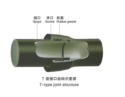 T型接口的結(jié)構(gòu)如圖所示。接口安裝時(shí),管子的插口外壁擠壓安放在承口內(nèi)的橡膠圈,使其壓縮變形而產(chǎn)生一定的接觸壓力, 利用橡膠圈的自密封作用來保持接口的密封性。