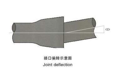 該接口具有結(jié)構(gòu)簡單,安裝方便,密封性能好等特點(diǎn)。在承口結(jié)構(gòu)上考慮了密封圈的定位和接口的偏轉(zhuǎn),通過控制插口的安裝深度,使得接頭具有一定的軸向伸縮量,因此,這種接口能適應(yīng)一定的基礎(chǔ)沉降,同時(shí)可利用其偏轉(zhuǎn)角θ實(shí)現(xiàn)管線長距離的轉(zhuǎn)向安裝,接口偏轉(zhuǎn)安裝如圖所示。膠圈由硬膠和軟膠兩部分組成,硬膠對(duì)管道接口有一定支撐和對(duì)心作用,同時(shí)安裝時(shí)也需要更大的推力。